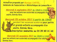 La prochaine animation « Au bout du conte... » présentée par Monique Cartel aura lieu pendant les vacances scolaires le mercredi 25 octobre à partir de 10h à la bibliothèque et est destinée aux petits et grands accompagnés d’un adulte. Entrée libre. Inscription souhaitée au 03 29 80 31 62.